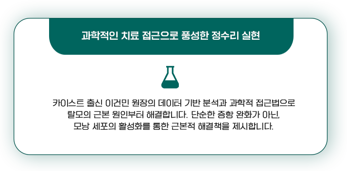 • 굿모나의원은 수만 건의 데이터와 과학적 접근을 바탕으로, 건강한 모발이 자라날 수 있는 최적의 환경을 만듭니다.